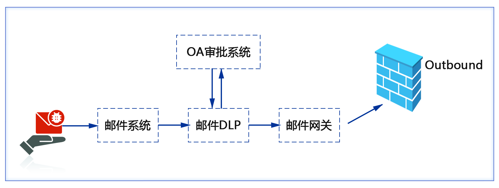 一般部署在邮件系统和邮件网关之间,扫描和管控内部员工外发的电子邮件,包括标题、内容和附件,对发现含有敏感信息的邮件进行隔离,交由相关人员审批,并根据审批结果对邮件进行放行或者阻止,最终实现对通过企业邮箱泄露敏感信息的精确管控。