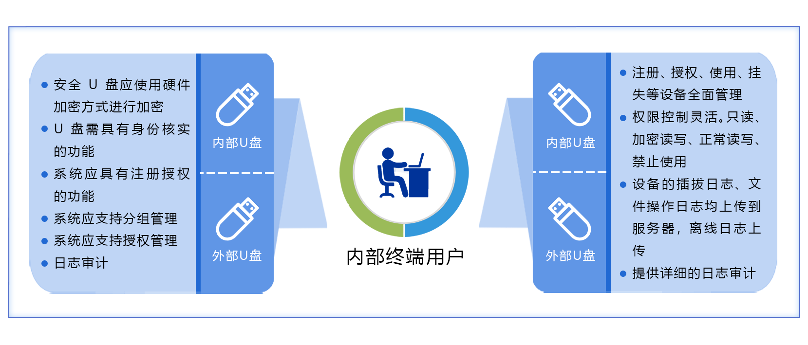 移动存储介质管理系统针对计算机客户端移动存储设备进行管理,实现了U盘、移动硬盘等移动存储设备完整的生命周期(注册、授权、使用、挂失、注销)管理与管控,既保证了计算机移动存储设备的正常使用,又能有效防止随意使用移动存储设备造成的资料外泄等安全隐患。